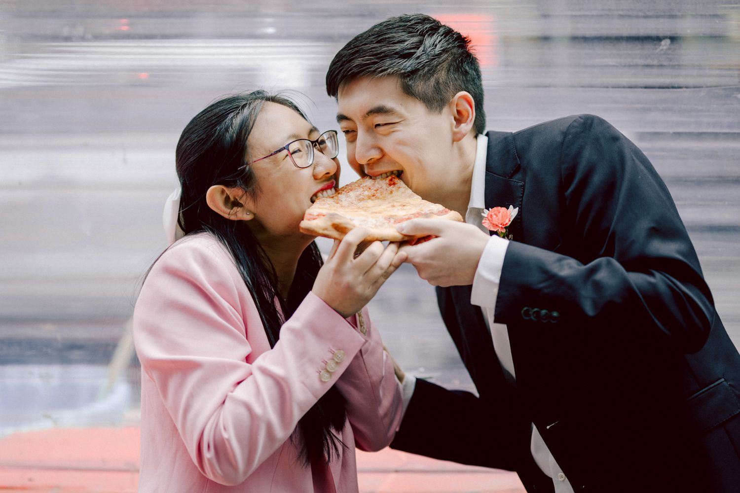 We stayed a while longer inside the marriage bureau took the opportunity to capture some timeless moments posing on the iconic green sofa and NYC City Hall wall mural. Then we journeyed outside and wandered the vibrant bustling streets of NYC for some more photos. And what better way to conclude Alicia and Kevin’s NYC City Hall elopement than with a quintessential New York slice.