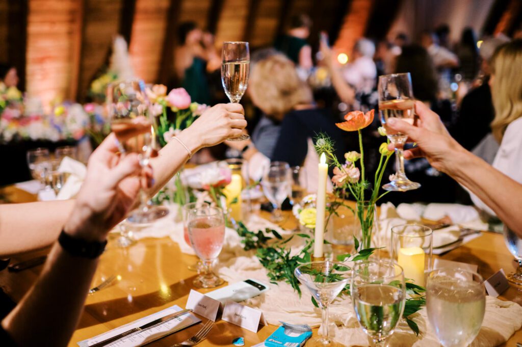 As the evening progressed upstairs at The Barn at Perona Farms, the ambiance was transformed by Moonlit Acres‘ stunning floral arrangements, candles, and elegant drapes. The space slowly filled with guests, reconnecting and sharing stories, delighted to be together again.