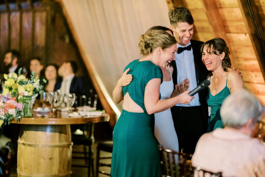 The ceremony took place outdoors on the lush lawn of The Barn at Perona Farms, exactly as they had envisioned – sweet, whimsy, and just the way they wanted it. Guests enjoyed a leisurely cocktail hour accompanied by live music courtesy of the talented Blue Label Band. The air was filled with the sounds of laughter and the clinking of wine glasses as everyone soaked in the joyful atmosphere.