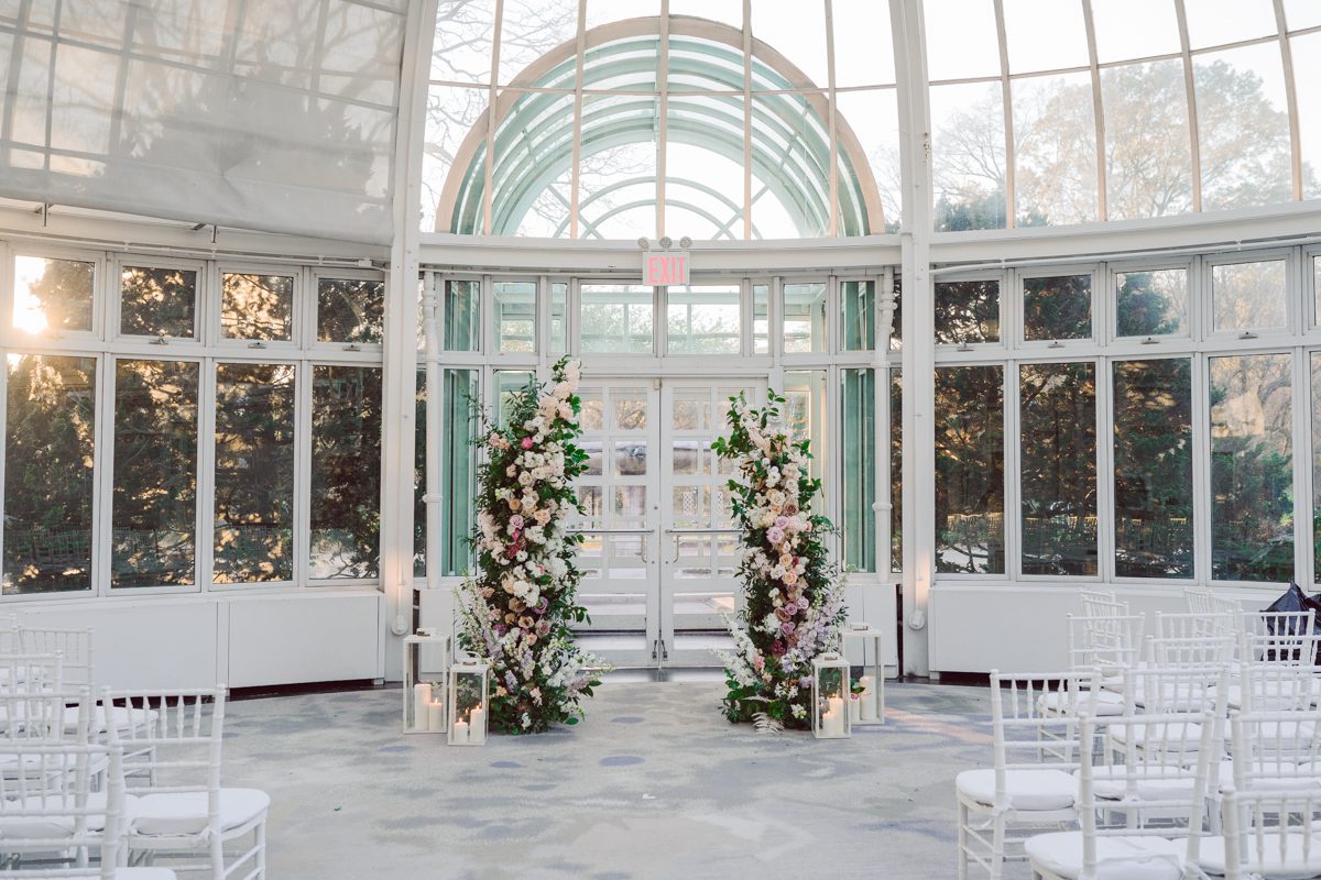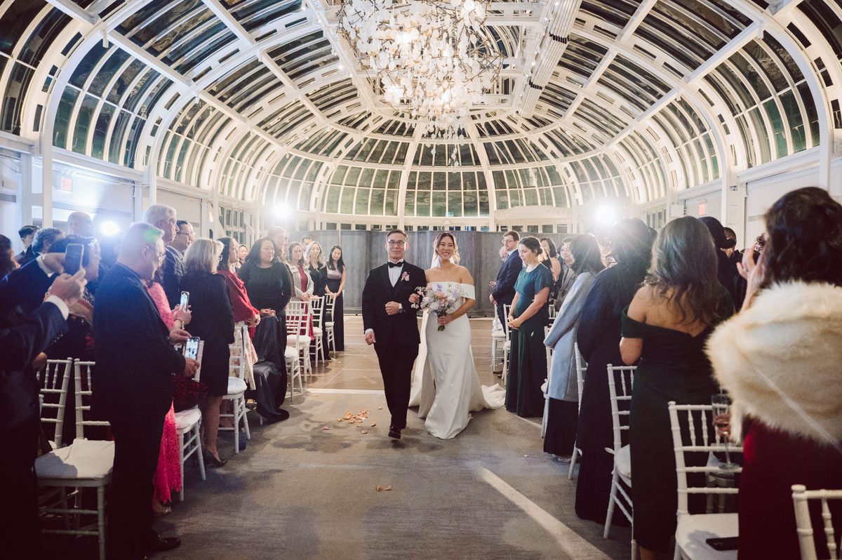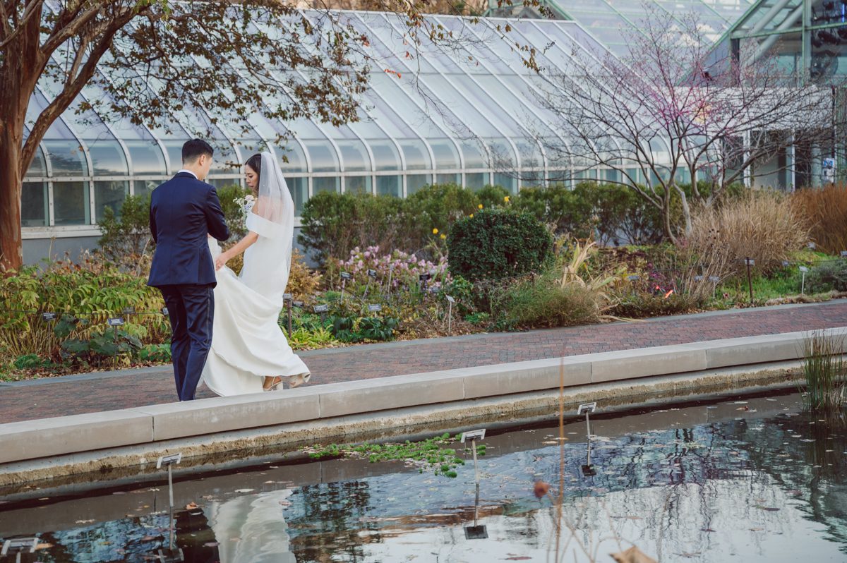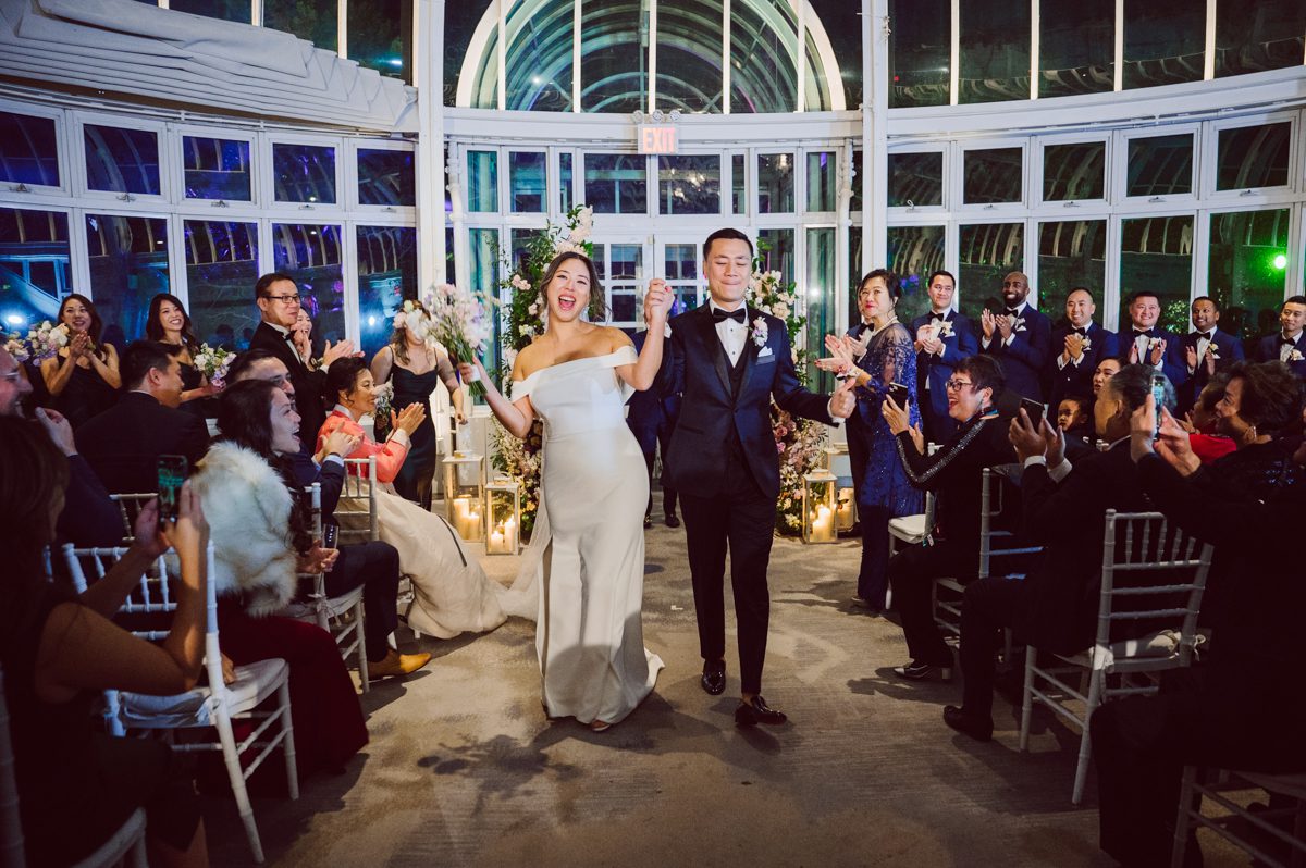 Florists from Oh Fleur NYC were all busy decorating The Palm House at Brooklyn Botanic Garden for the wedding ceremony, Ariana changed into her Sarah Seven wedding dress from her previous outfit “Hanbok” (traditional Korean outfit).